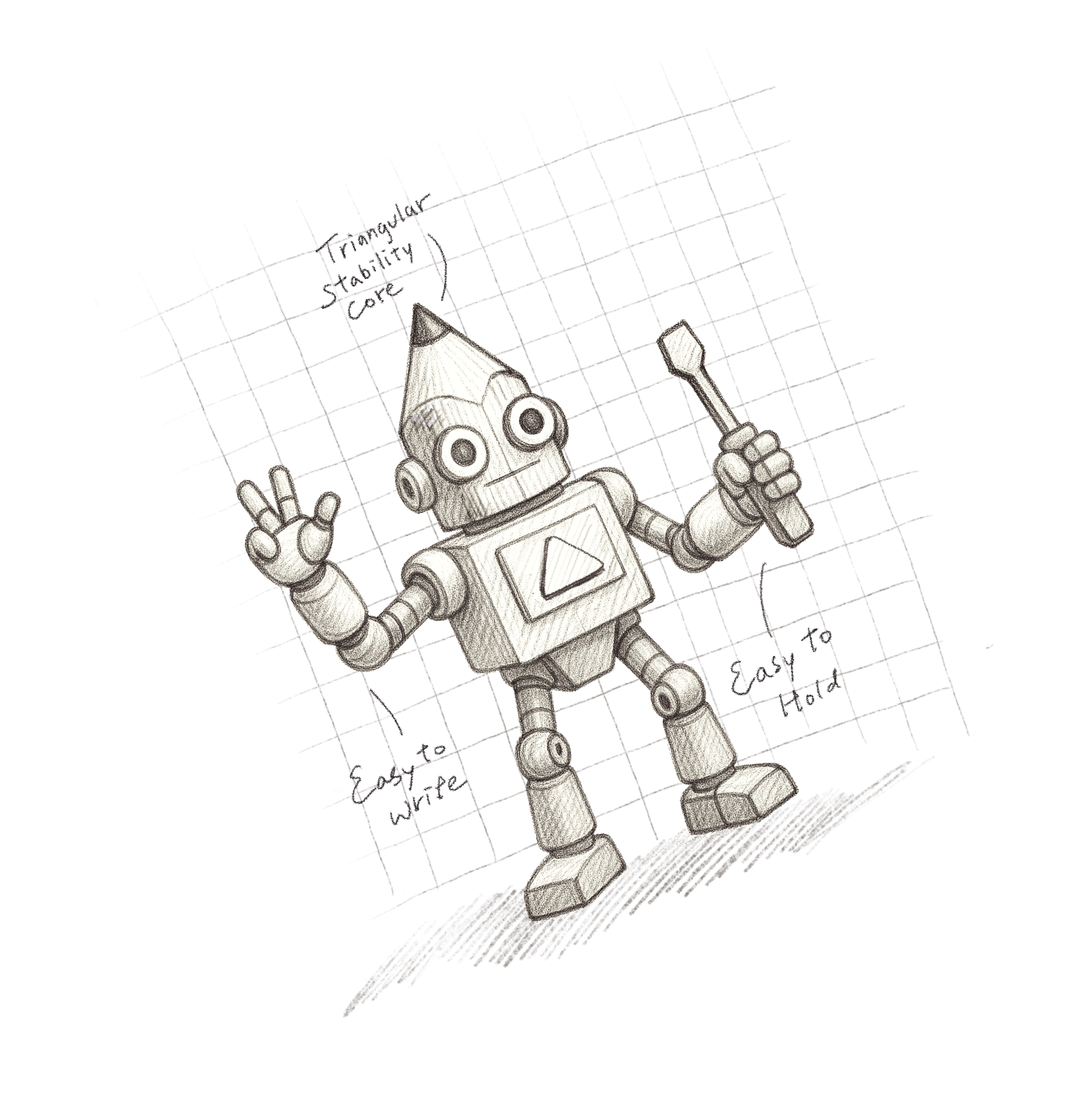 The robot is illustrated using pencil-like strokes to emphasize a hand-drawn, approachable style. Handwritten-style annotations are added to label the robot’s various functions, symbolizing the key features and advantages of the triangular pencil, such as grip, stability, and writing performance. The pencil itself is redesigned with a clean decorative line on one side and a refined treatment on the top of the shaft, combined with bold contrasting colors. This approach creates a bright, lively, and highly recognizable visual identity, balancing the brand’s professional image with a child-friendly appeal.